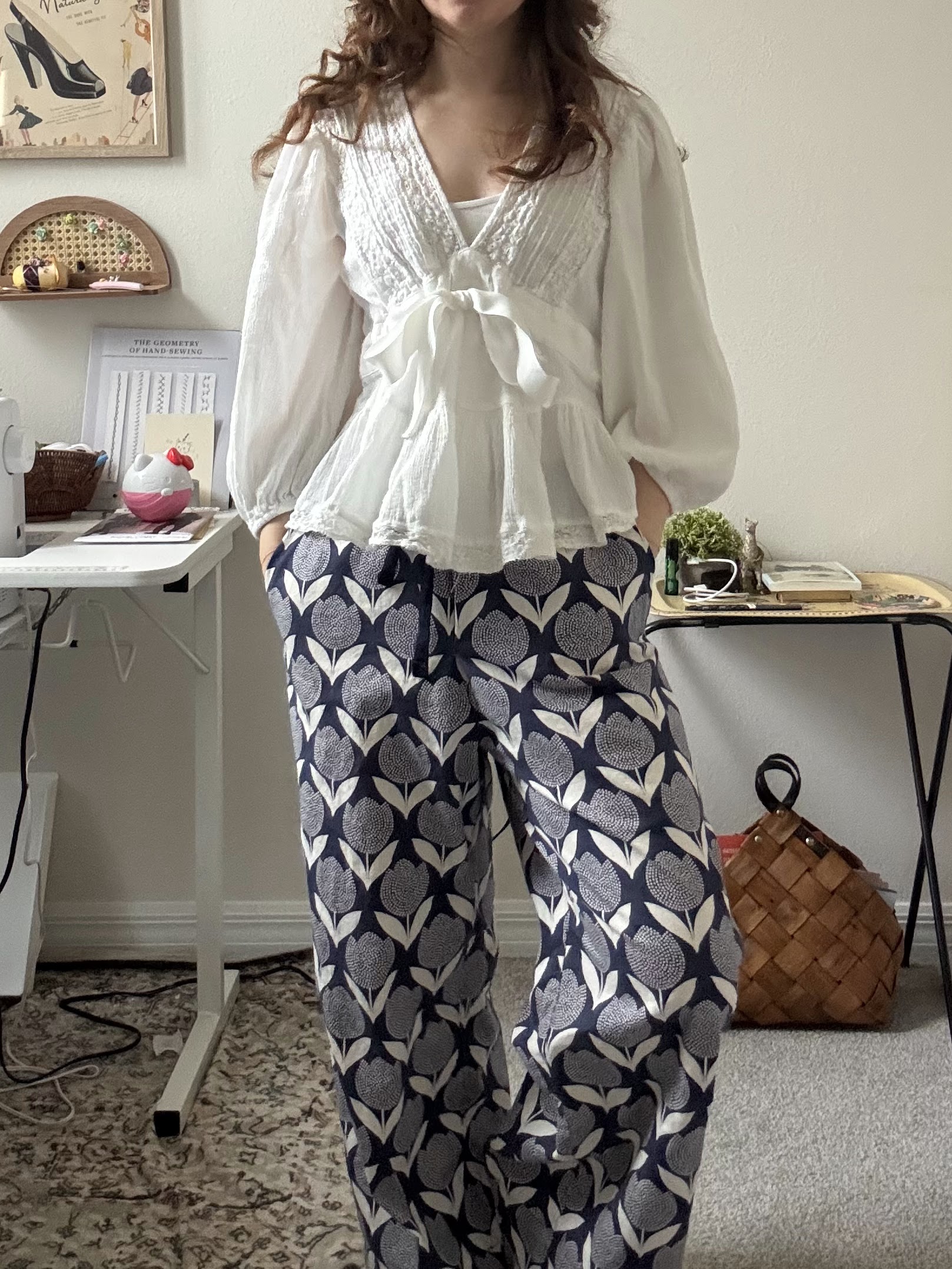 Since being introduced to this pattern last year, I've now made three pairs of Lane Pants, and through the magic of clever pattern design, they all feel uniquely distinct from each other. As the temperature starts to creep up here, my latest version was a pair of shorts, which took a very small amount of pattern modification (I'm dipping my toe in). The tulip-patterned ones were taken to France, making it into luggage is quite the accomplishment for something I've sewn.